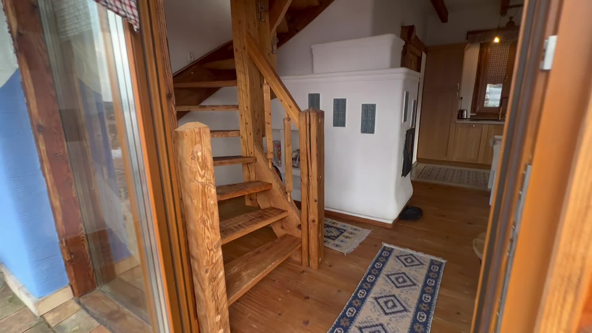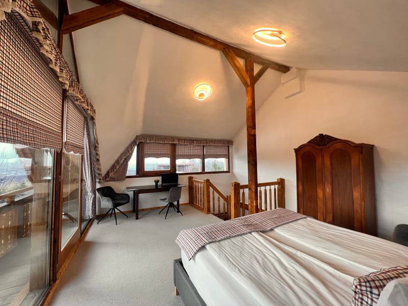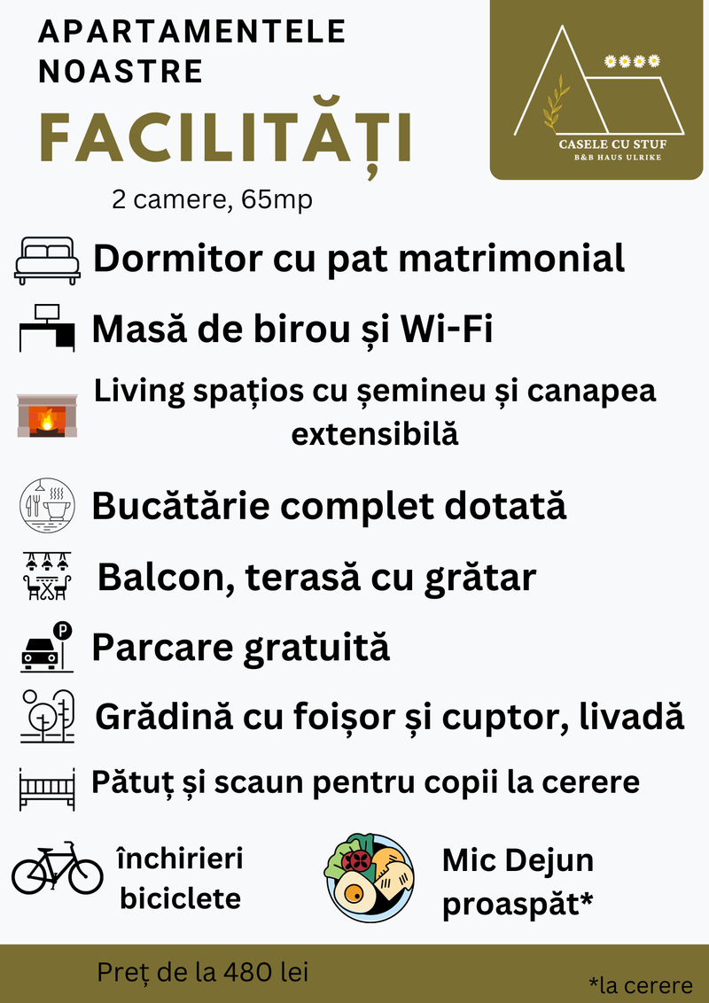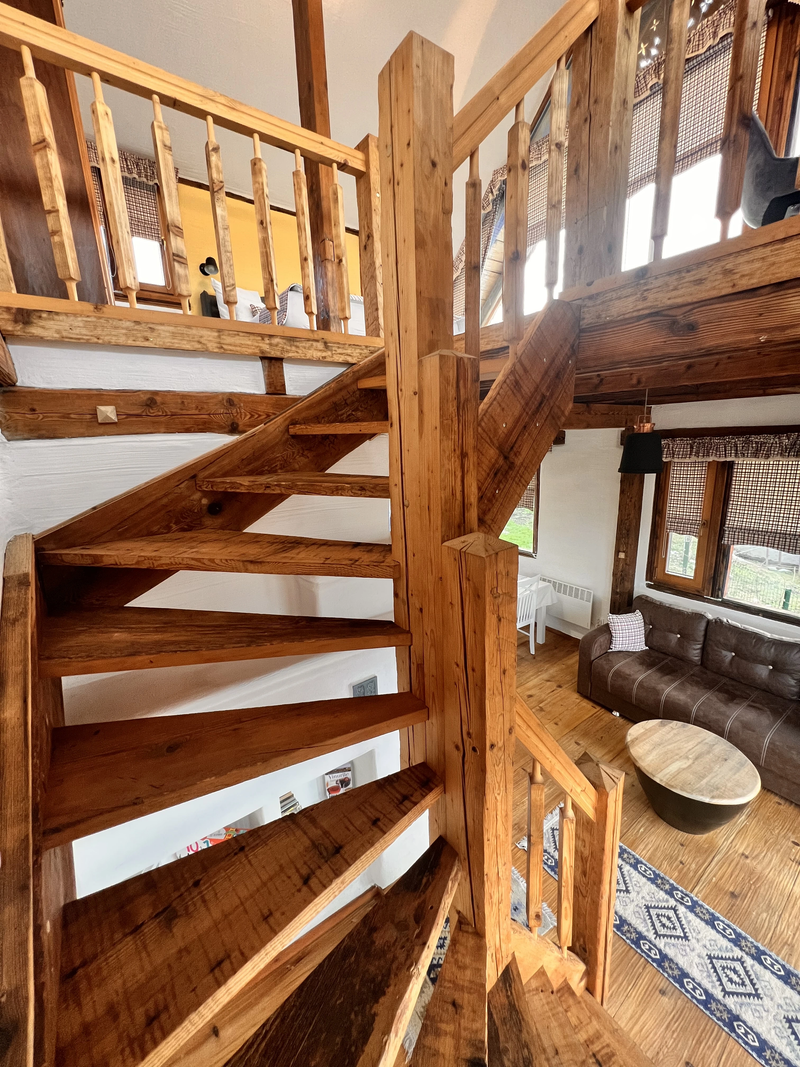 In fiecare seara apusul ii incalzeste ferestrele prin jocul de lumini, asa culoare peretelui dormitorului a primit atingerea galbena. Are un living mare si spatios, un semineu pe lemne care emana o caldura placuta si un semntiment de camin. Bucataria este dotata cu toate cele necesare, baia are incalzire in pardoseala si un dus al carui perete este incalzit de semineu. In dormitorul se urca pe o scara de lemn frumoasa, acesta este spatios, cu un pat matrimonial, un fotoliu de citit si un birou.